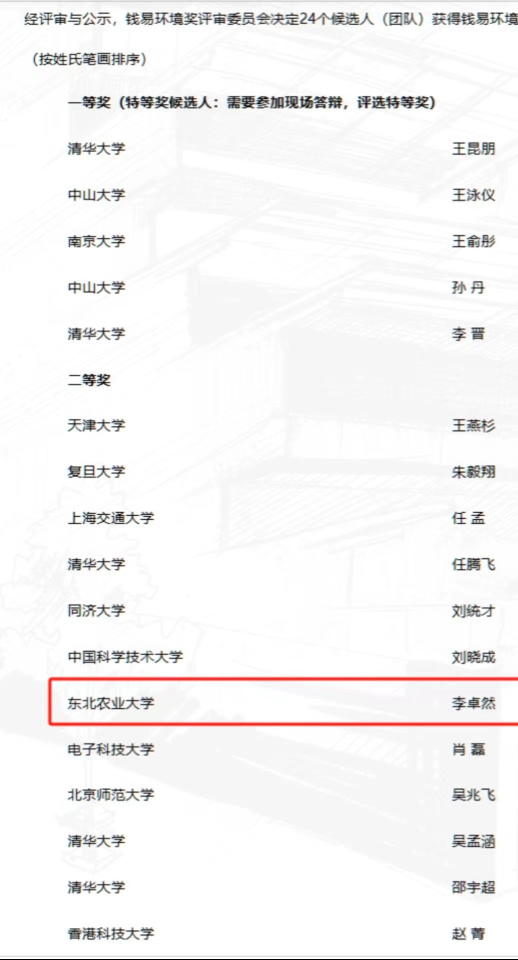近日,钱易环境奖评审委员公布了第七届获奖名单,我院2022级硕士研究生李卓然荣获第七届“钱易环境奖”二等奖,是我校学生在环境领域首次获得该奖项,也是获奖等级最高的一次。